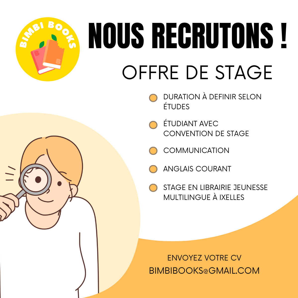 Envoie ton CV + un court mail expliquant pourquoi tu as envie de faire ton stage chez nous ou mieux encore, passe nous voir à la librairie (et, si tu as, un exemple de contenu que tu as créé) à : bimbibooks@gmail.com